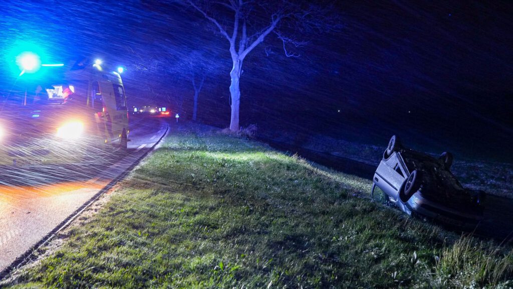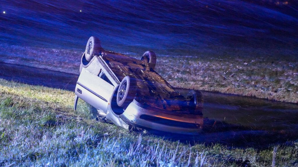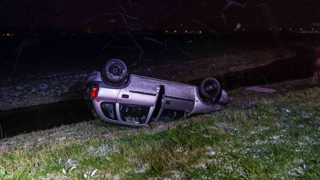 Auto vliegt over de kop op N241. Gladheid mogelijke oorzaak.