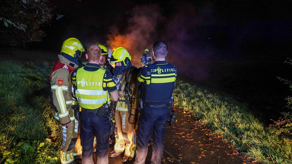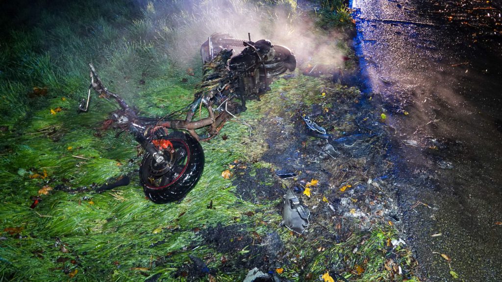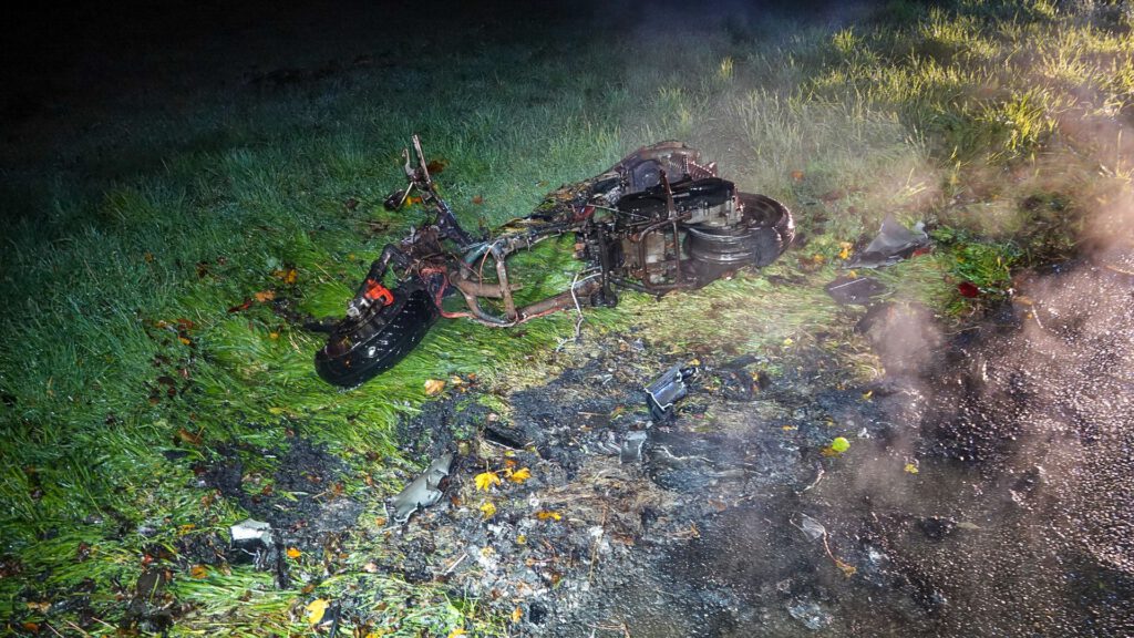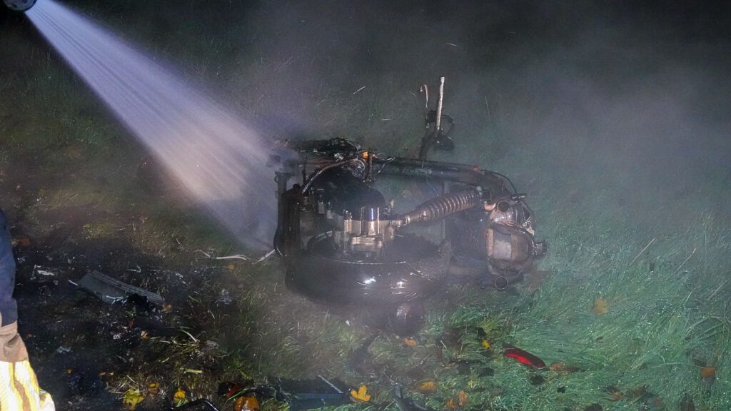 Toegesnelde brandweerlieden hebben het vuur -wat inmiddels ook was overgeslagen op het gras en het asfalt- weten te blussen. Op de uitgebrande scooter zijn geen kentekenplaten meer zichtbaar. De oorzaak van het vuur is nog onduidelijk.