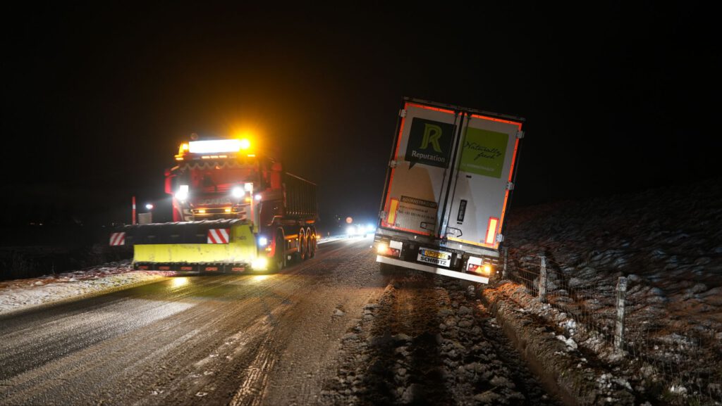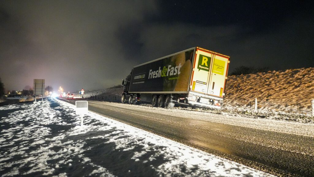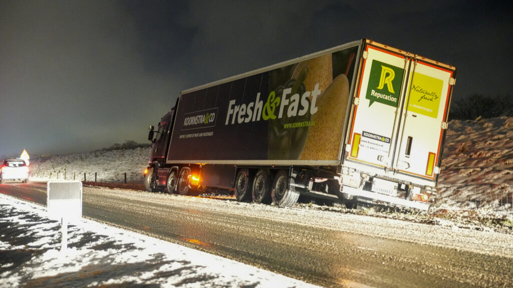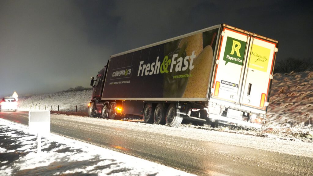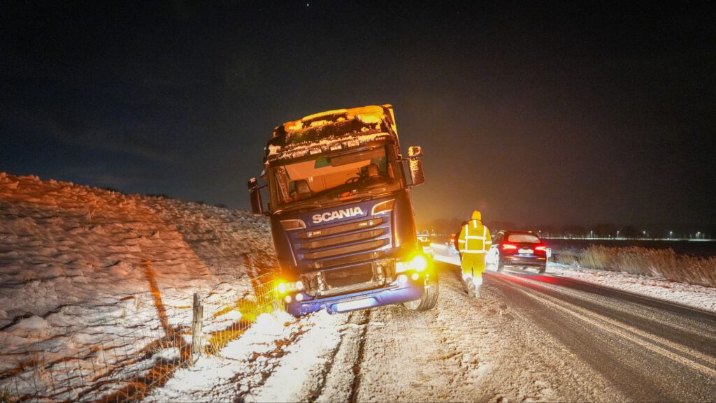 de trucker reed vanaf de A7 richting Lambertschaag toen het mis ging en de vrachtwagen door de gladheid begon te schuiven en in de berm tot stilstand kwam.