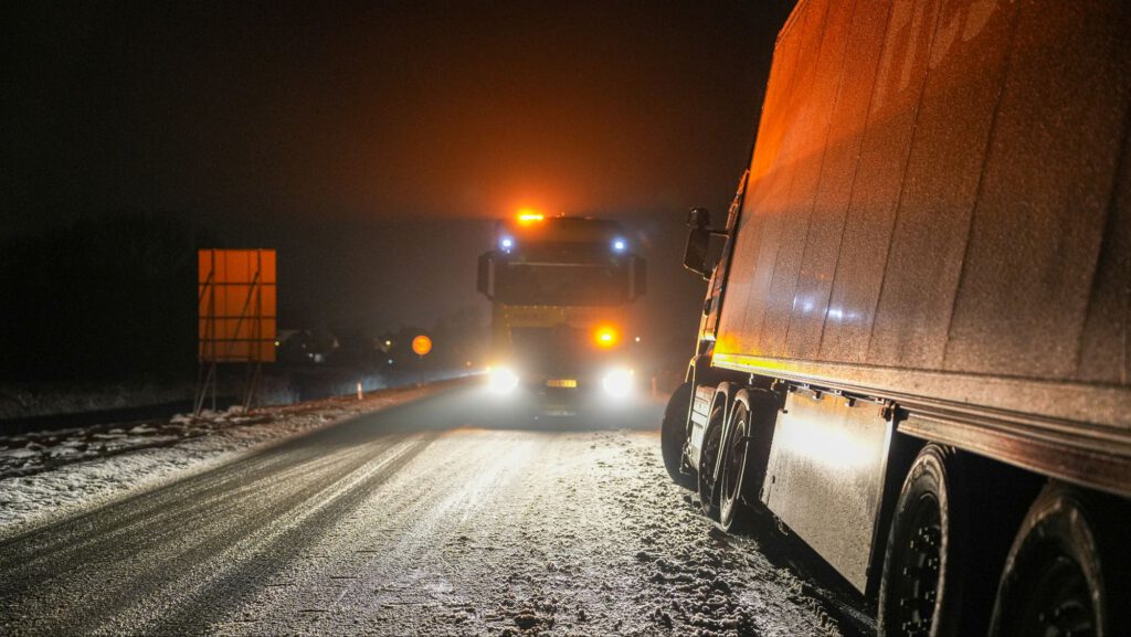 Vrachtwagen vast in berm op gladde N239
